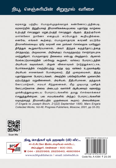 வரலாறு பற்றிய பொருள்முதல்வாதக் கண்ணோட்டத்தின்படி. வரலாற்றில் இறுதியாகத் தீர்மானிக்கக்கூடியவை யதார்த்த வாழ்வை உற்பத்தி செய்தலும் மறுஉற்பத்தி செய்தலும் ஆகும். இதற்குமேல் மார்க்ஸோ நானோ எதையும் எப்போதும் கூறியதில்லை. எனவே. எங்கள் கூற்றை. பொருளாதாரக் காரணி மட்டுமே தீர்மானிக்கக்கூடிய ஒரே காரணி என நாங்கள் சொல்வதாக யாரேனும் திரித்துக் கூறுவாரேயானால். அவர் இந்தக் கருத்தோட்டத்தை அர்த்தமற்ற, அருவமான. அறிவுக்குப் பொருத்தமற்ற சொற்றொடராக மாற்றுகிறார். பொருளாதார நிலைமை என்பது அடித்தளம். ஆனால் மேல்கட்டுமானத்தின் பல்வேறு கூறுகள், வர்க்கப் போராட்டத்தின் அரசியல் வடிவங்கள், அதன் விளைவுகள் (எடுத்துக்காட்டாக, போர்க்களத்தில் வெற்றிபெற்று வந்த ஒரு வர்க்கம் உருவாக்குகிற அரசியல் சாசனங்கள் போன்றவை), நீதி முறைமைகள், இந்த யதார்த்தமான போராட்டங்கள். அவற்றில் பங்கேற்போரின் மூளையில் ஏற்படுத்தும் மறுவினைகள், அரசியல். நீதிபரிபாலன. தத்துவக் கோட்பாடுகள். சமயச் சிந்தனைகள், மீற முடியாத புனிதக் கோட்பாடுகளாக அவை அடையும் வளர்ச்சி ஆகியனவும் வரலாற்று முக்கியத்துவமுடைய போராட்டங்களில் தமது செல்வாக்கைச் செலுத்துகின்றன. பல சமயங்களில் அந்தப் போராட்டங்களின் வடிவத்தைத் தீர்மானிப்பதில் முதன்மைக் கூறாய் அமைகின்றன. (F.Engels to Joseph Bloch, 21[22] September 1890, Marx Engels Collected Works, Vol.49, Progress Publishers, Moscow, 2001, pp 33-35).