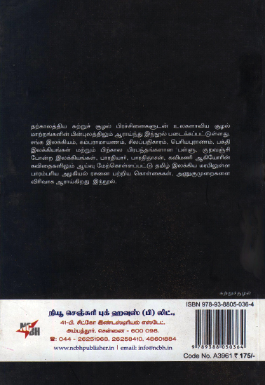 தற்காலத்திய சுற்றுச் சூழல் பிரச்சினைகளுடன் உலகளாவிய சூழல் மாற்றங்களின் பின்புலத்திலும் ஆராய்ந்து இந்நூல் படைக்கப்பட்டுள்ளது. சங்க இலக்கியம், கம்பராமாயணம், சிலப்பதிகாரம், பெரியபுராணம், பக்தி இலக்கியங்கள் மற்றும் பிற்கால பிரபந்தங்களான பள்ளு, குறவஞ்சி போன்ற இலக்கியங்கள். பாரதியார், பாரதிதாசன். கவிமணி ஆகியோரின் கவிதைகளிலும் ஆய்வு மேற்கொள்ளப்பட்டு தமிழ் இலக்கிய மரபிலுள்ள பாரம்பரிய அழகியல் ரசனை பற்றிய கொள்கைகள், அனுகுமுறைகளை விரிவாக ஆராய்கிறது இந்நூல்.