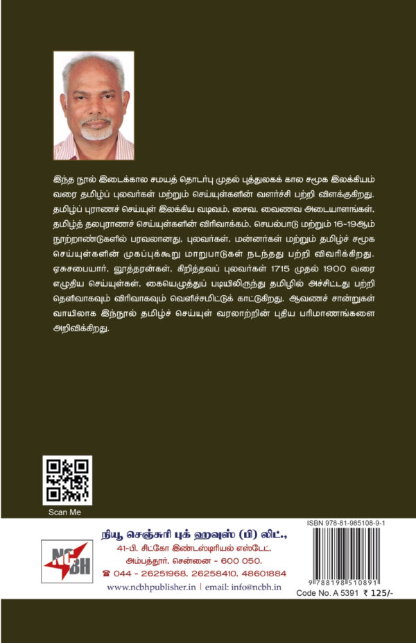 இந்த நூல் இடைக்கால சமயத் தொடர்பு முதல் புத்துலகக் கால சமூக இலக்கியம் வரை தமிழ்ப் புலவர்கள் மற்றும் செய்யுள்களின் வளர்ச்சி பற்றி விளக்குகிறது. தமிழ்ப் புராணச் செய்யுள் இலக்கிய வடிவம், சைவ, வைணவ அடையாளங்கள், தமிழ்த் தலபுராணச் செய்யுள்களின் விரிவாக்கம், செயல்பாடு மற்றும் 16-19ஆம் நூற்றாண்டுகளில் பரவலானது, புலவர்கள், மன்னர்கள் மற்றும் தமிழ்ச் சமூக செய்யுள்களின் முகப்புக்கூறு மாறுபாடுகள் நடந்தது பற்றி விவரிக்கிறது. ஏசுசபையார், லூத்தரன்கள், கிறித்தவப் புலவர்கள் 1715 முதல் 1900 வரை எழுதிய செய்யுள்கள், கையெழுத்துப் படியிலிருந்து தமிழில் அச்சிட்டது பற்றி தெளிவாகவும் விரிவாகவும் வெளிச்சமிட்டுக் காட்டுகிறது. ஆவணச் சான்றுகள் வாயிலாக இந்நூல் தமிழ்ச் செய்யுள் வரலாற்றின் புதிய பரிமாணங்களை அறிவிக்கிறது.