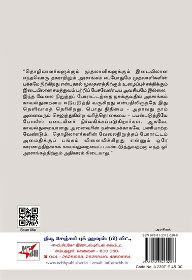 “தொழிலாளர்களுக்கும் முதலாளிகளுக்கும் இடையிலான எந்தவொரு தகராறிலும் அரசாங்கம் எப்போதுமே முதலாளிகளின் பக்கமே நிற்கிறது என்பதால் மூலதனத்திற்கும் உழைப்புச் சக்திக்கும் இடையிலான சமத்துவம் பற்றிப் பேசவேண்டிய அவசியமே இல்லை. இந்த வேலை நிறுத்தப் போராட்டத்தை நசுக்குவதில் அரசாங்கம் காவல்துறையை ஈடுபடுத்தி வருகிறது என்பதிலிருந்தே இது தெளிவாகத் தெரிகிறது. பொது நிதியை – அதாவது நாம் அனைவரும் செலுத்துகின்ற வரித்தொகையை – பயன்படுத்தியே போலீஸ் படையினர் நிர்வகிக்கப்படுகிறார்கள். ஆகவே, காவல்துறையானது அனைவரின் நன்மைக்காகவே பணியாற்ற வேண்டும். தொழிலாளர்களின் வேலைநிறுத்தப் போராட்டம் அமைதிக்குப் பங்கம் விளைவிக்கிறது என்னும் ஒரே காரணத்திற்காகக் காவல்துறையைப் பயன்படுத்துவதற்கு எந்த ஓர் அரசாங்கத்திற்கும் அதிகாரம் கிடையாது.”