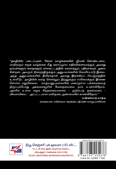 “தகழியின் படைப்புகள், கேரள வாழ்க்கையின் ஜீவன் கொண்டவை, மாறிவரும் சமூக வாழ்க்கை மீது கலாப்பூர்வ எதிர்வினையாற்றும் அவரது நாவல்களும் கதைகளும் காலகட்டத்தின் வரலாற்றுப் பதிவாகவும் அமை கின்றன. அவருள் நிறைந்திருக்கும் அனுபவங்களின் வெளிப்பாடு இவை. அந்த அனுபவங்களின் தீவிரம்தான் அவரது இலக்கியப் பிரபஞ்சத்தின் உள்ளீடு, தகழியின் கதை சொல்லும் திறனுக்கும் எளிமைக்கும் இணை சொல்ல ஏதுமில்லை. வாழ்வனுபவங்களின் மணமுள்ள பக்கங்களைத் திருப்பும்போது அக்கலைஞரின் மேதைமையை நாம் உணர்கிறோம். அவரில் உள்ள சமூக சிந்தனையாளரை – குடும்பத் தலைவரை – விவசாயியை – அப்பட்டமான மனிதரை அண்மையில் காண்கிறோம்,”