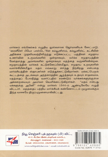 மார்க்சும் எங்கெல்சும் எழுதிய நூல்களான ஜெர்மானியக் கோட்பாடு. “ரைனீசெர் பியோ பாஸ்டெரின் கம்யூனிஸம், கம்யூனிஸ்ட் கட்சியின் அறிக்கை முதலியவற்றிலிருந்து எடுக்கப்பட்ட பகுதிகள் சமுதாய உணர்வின் உருவங்களில் ஒன்றாகவும். வர்க்க சமுதாயத்தின் மேல்தளத்து அம்சங்களில் ஒன்றாகவும் மதத்தை வருணிக்கின்றன.