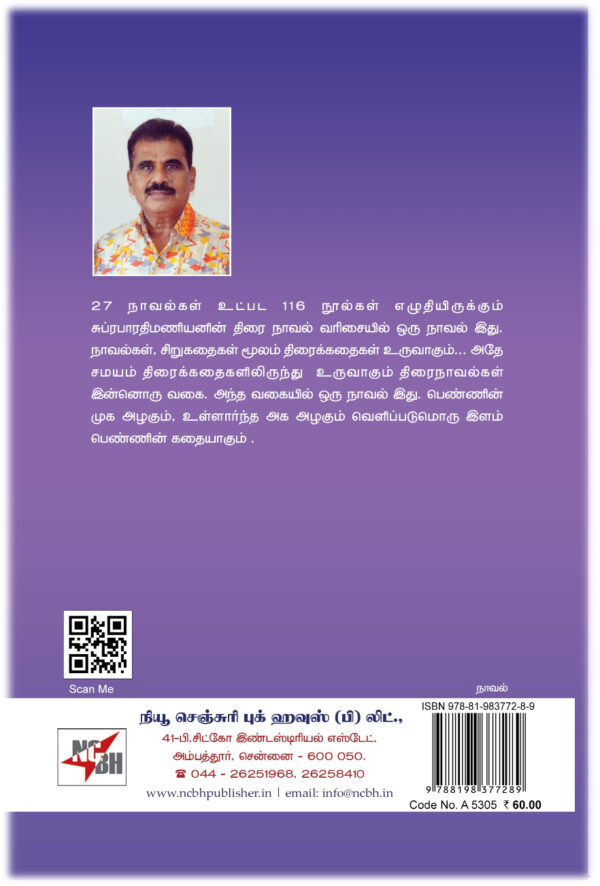 27 நாவல்கள் உட்பட 116 நூல்கள் எழுதியிருக்கும் சுப்ரபாரதிமணியனின் திரை நாவல் வரிசையில் ஒரு நாவல் இது. நாவல்கள், சிறுகதைகள் மூலம் திரைக்கதைகள் உருவாகும்… அதே சமயம் திரைக்கதைகளிலிருந்து உருவாகும் திரைநாவல்கள் இன்னொரு வகை. அந்த வகையில் ஒரு நாவல் இது. பெண்ணின் முக அழகும், உள்ளார்ந்த அக அழகும் வெளிப்படுமொரு இளம் பெண்ணின் கதையாகும்.