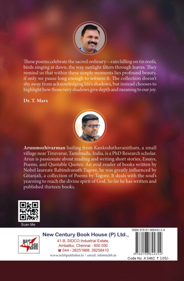 Arunmozhivarman hailing from Kankoduthavanitham, a small village near Tiruvarur, Tamilnadu, India, is a PhD Research scholar. Arun is passionate about reading and writing short stories, Essays, Poems, and Quotable Quotes. An avid reader of books written by Nobel laureate Rabindranath Tagore, he was greatly influenced by Gitanjali, a collection of Poems by Tagore. It deals with the soul’s yearning to reach the divine spirit of God. So far he has written and published thirteen books